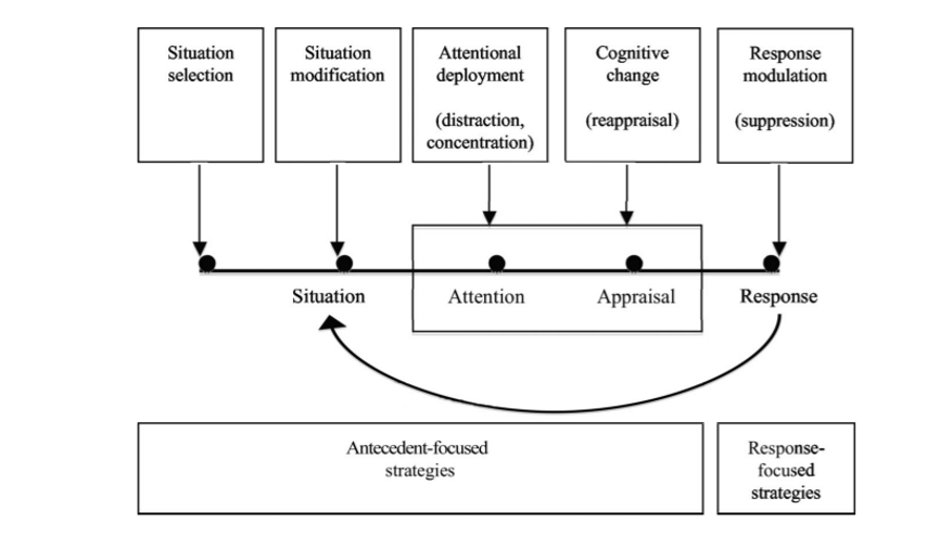This model views emotion regulation as a process and identifies five interconnected strategies that can be used to change the course of the emotion and how it is experienced. These are situation selection, situation modification, attentional deployment, cognitive change, and response modulation. It suggests that emotion regulation strategies that intervene early in the process are likely to be more effective than strategies that intervene later, after emotional response tendencies are activated (Sheppes and Gross, 2012).